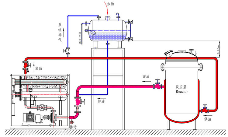 对于导热油加热器,热量是由浸入导热油的电加热元件产生和传输的,以导热油为介质,利用循环泵,强制导热油进行液相循环,将热量传递给用一个或多种用热设备,经用热设备卸载后,重新通过循环泵,回到加热器,再吸收热量,传递给用热设备,从此周而复始,实现热量的连续传递,使被加热物体温度升高,达到加热的工业要求。