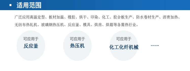 2、 油脂工业:脂肪酸蒸馏、油脂分解、浓缩、酯化、真空臭等反应釜控温、 反应釜加热等;3、 合成纤维工业:聚合、熔融、纺丝、延伸、干燥等;4、 纺织印染工作:热定型辊筒加热、烘房加热、热容染色等;